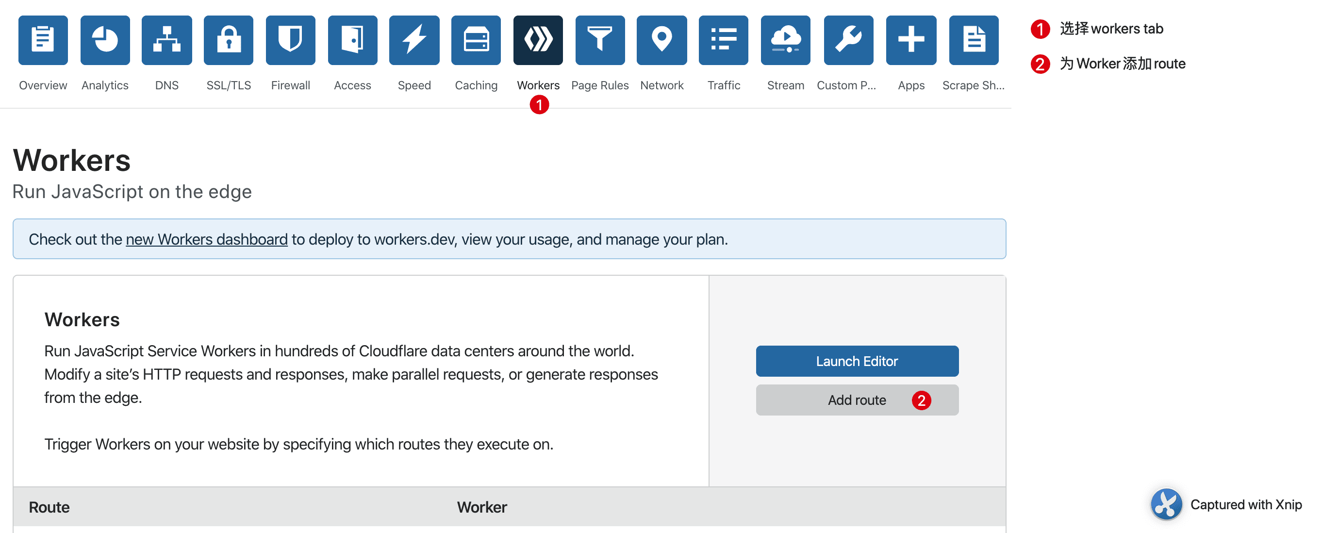 自定义域名的前提是域名通过CloudFlare管理的,选择对应域名后,选择Workers tab,然后添加route:
